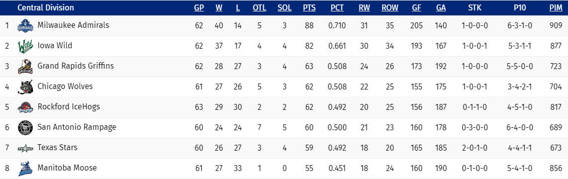 From the IceHogs' season-opener on Oct. 4 through Dec. 20, the IceHogs held an overall record of 17-10-0-1 and reached as high as second place in the Central Division. However, from Dec. 21 through Feb. 1, Rockford won just three matchups, going 3-14-1-1 in that span and falling to sixth place in the division. But, the club has since righted the ship by winning nine of their last 16 since Feb. 4, jumping into a tie for the fourth and final playoff spot in the Central Division.